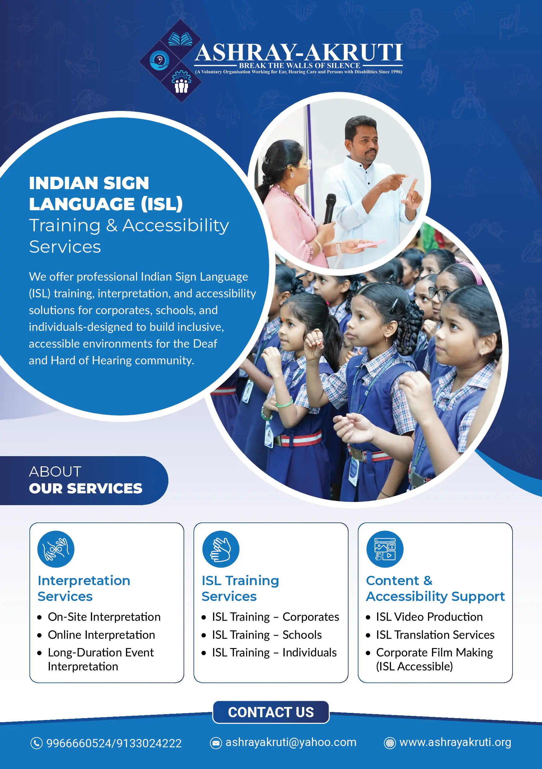 Ashray Akruti is a registered nonprofit, non-religious, Non- Government organization working for people with disabilities with a focus on children with hearing loss. Established in Hyderabad in the year 1996, the organization implements projects across Telangana and Andra Pradesh.